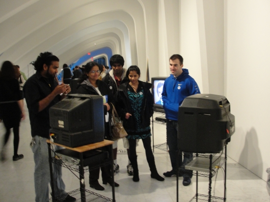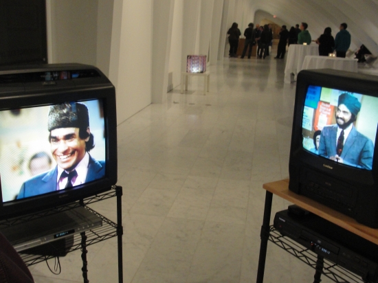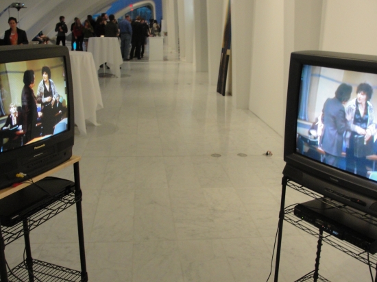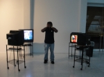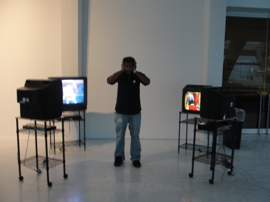 “Por favor Excusez-moi Lingua” is multi-channel video installation involving appropriated video clips displayed on six different monitors. The monitors are positioned to face each other, three on one side and three on the other side arranged in a semi-circular fashion as shown on the images below. The installation contains audio related to the video clips on the monitors. The piece will be installed in a 10ft (length) x 7 ft (width) long area.