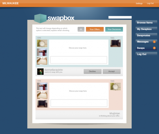 Swapbox is a participatory web environment that encourages users to exchange their property at no cost. Check out the screen shots below.