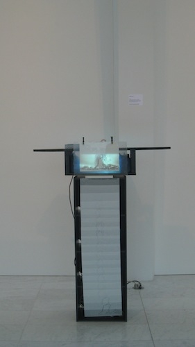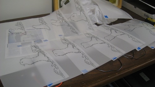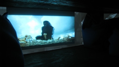 Trace consists of a curated selection of individual frames of a film, extracted and hand-traced onto semi-transparent paper and then illuminated from behind with a projector. The content for the tracings and the projection is a five second clip from the prehistoric introduction to Stanley Kubrick’s 2001: A Space Odyssey, a cerebral and dystopic story about primitivity, technology, and unearthing. The structure holding Trace is dark and provocative, calling attention to itself both as a structure to support an artwork and as a sculptural design.