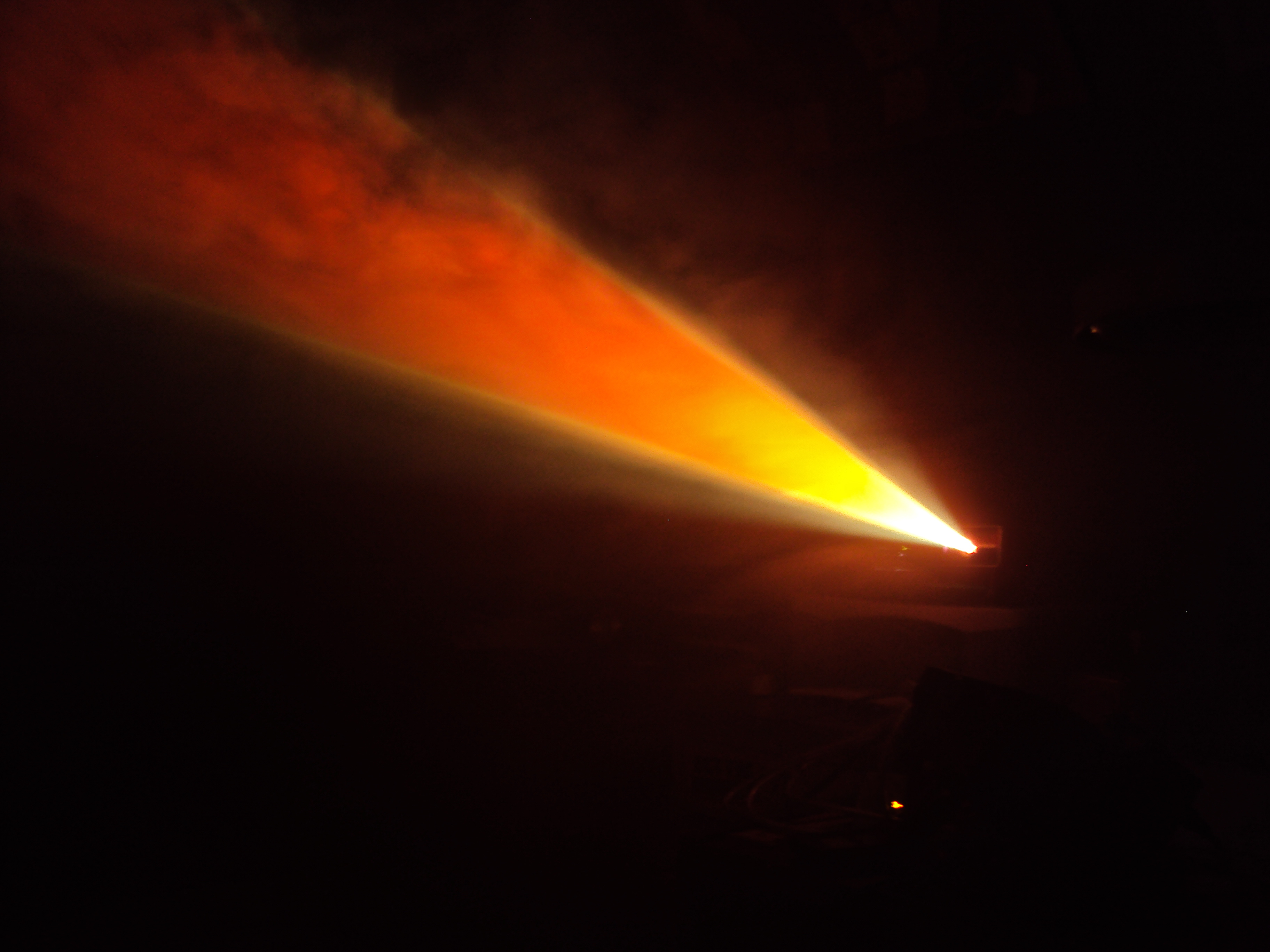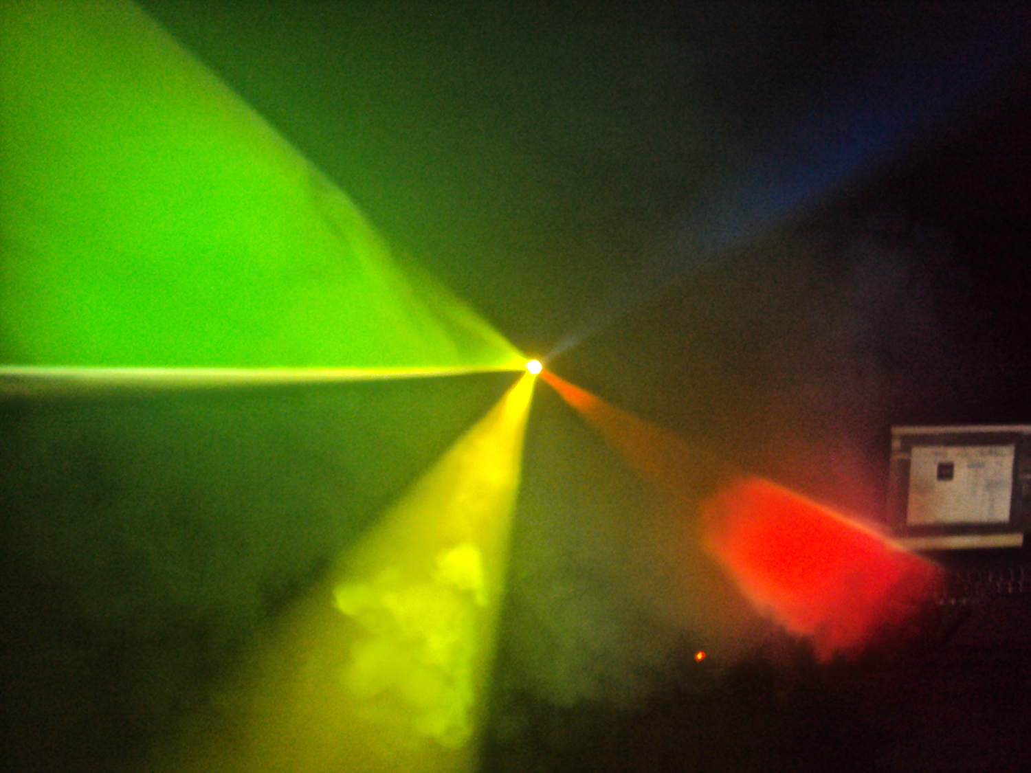 There are three mandatory conditions for this project to work properly: First, the room has to be as dark as possible for the projections to be viewed. Second, there must be enough fog in the room for the projections to appear as beams of light. Third, safety precautions must be exercised; this means mounting everything out of the way so the users won’t trip over wires or equipment… and also making sure the fog doesn’t set off the smoke detector.