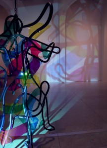 Movement is the process of converting static energy to kinetic energy. My piece portrays the effect of movement and energy through a life size hanging sculpture. The sculpture is comprised of three outlined figures interwoven so that each original outline is slightly skewed. Wrapped around the figures are sheets of interlocking photo gels. These gels portray the flow of kinetic energy around the piece. Light from three video projectors adds a luminous quality. This paired with slow rotation turns the pieces static energy into kinetic energy, while creating colored apparitions of light that glide around the room. The energy that this piece creates flows all around us. It is the building blocks for life. If we learn to harness this energy around and within, the possibilities are infinite.