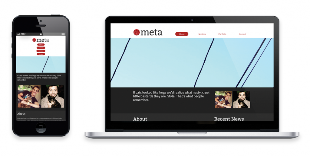 The way that we interact with the Internet is changing – we are spending less time behind computer screens and more time flicking through pages on our mobile devices. This shift in platforms has exposed several issues with many of the websites on the internet – the main issue being usability. These days, mobile devices come in all shapes and sizing, meaning that their viewports do not have consistent dimensions and resolutions. Responsive web design was developed to counter this unpredictability. The goal of responsive design is to create a website that seamlessly adapts to it’s viewing environment. Maintaining an attractive product while still preserving usability is the key to good responsive design. The Meta website is my attempt experiment and, hopefully, create a website that does this across most platforms.