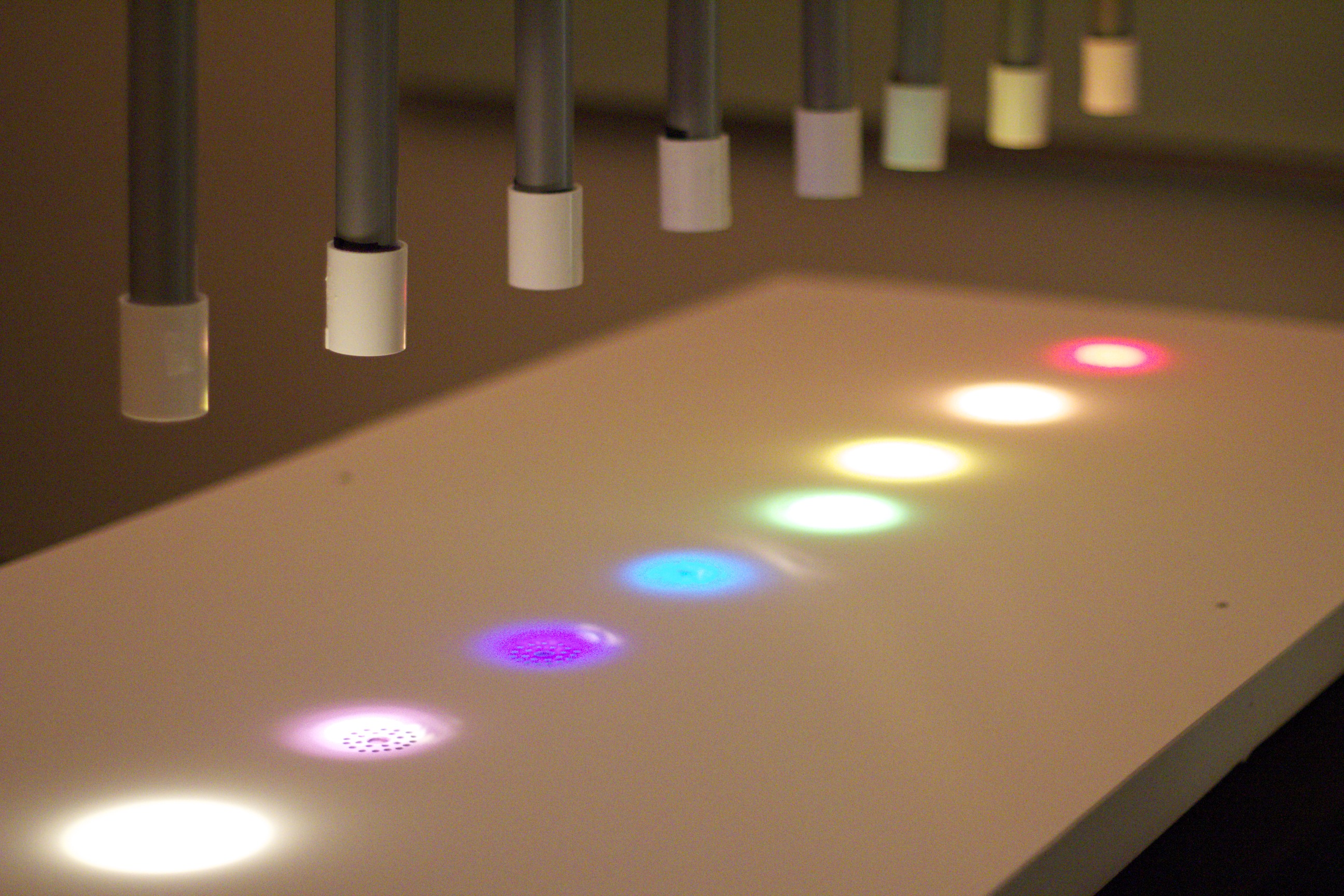 ChromaKeys is an installation piece that explores the presence and movement of people as a material by combining light, color, and sound. The purpose is to combine light, color, and sound into one by the participation of the viewer. Multiple people are able to approach the lights and form chords and songs with their own hands in the beams of light.